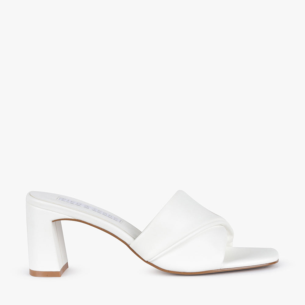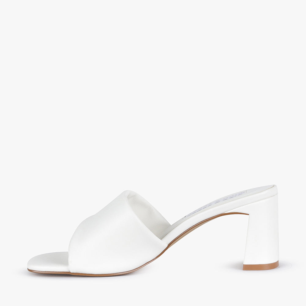 Aniston is a camel block heel mule.
