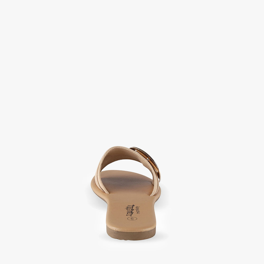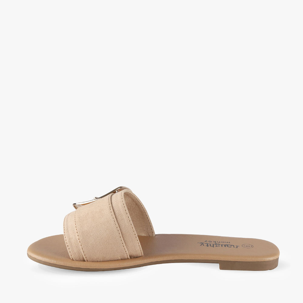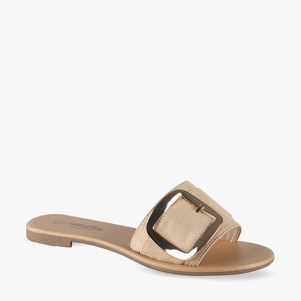 Brixton is a sandal slide featuring a gold buckled single strap and soft faux suede fabric. This seasons must-have sandals looks great with a neutral midi dress and denim jacket. Step into Brixton slides by Naughty Monkey!