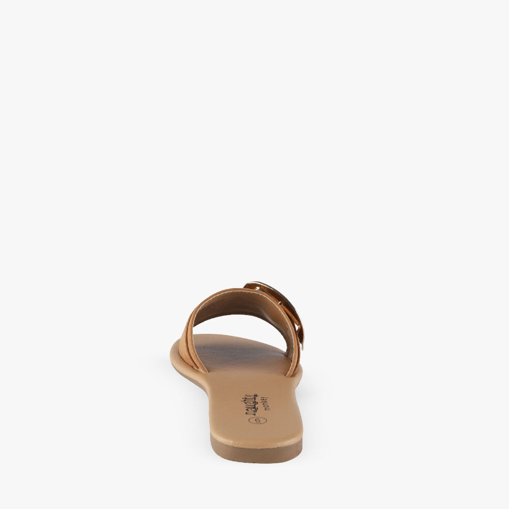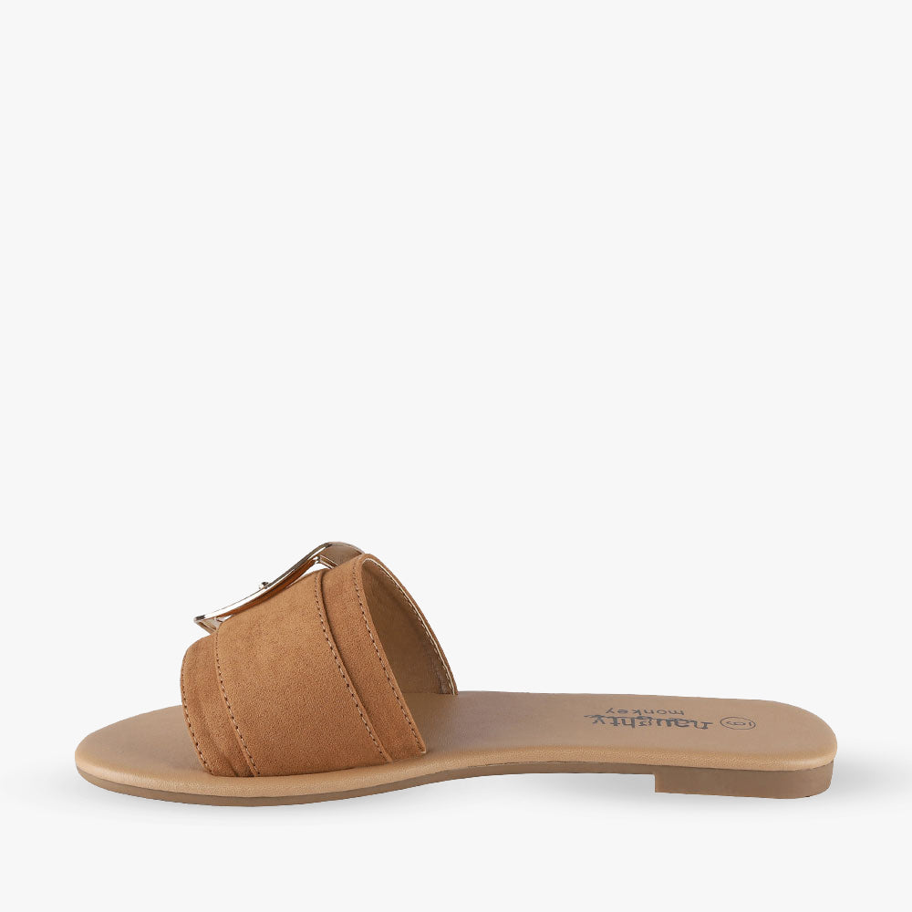 Brixton is a sandal slide featuring a gold buckled single strap and soft faux suede fabric. This seasons must-have sandals looks great with a neutral midi dress and denim jacket. Step into Brixton slides by Naughty Monkey!