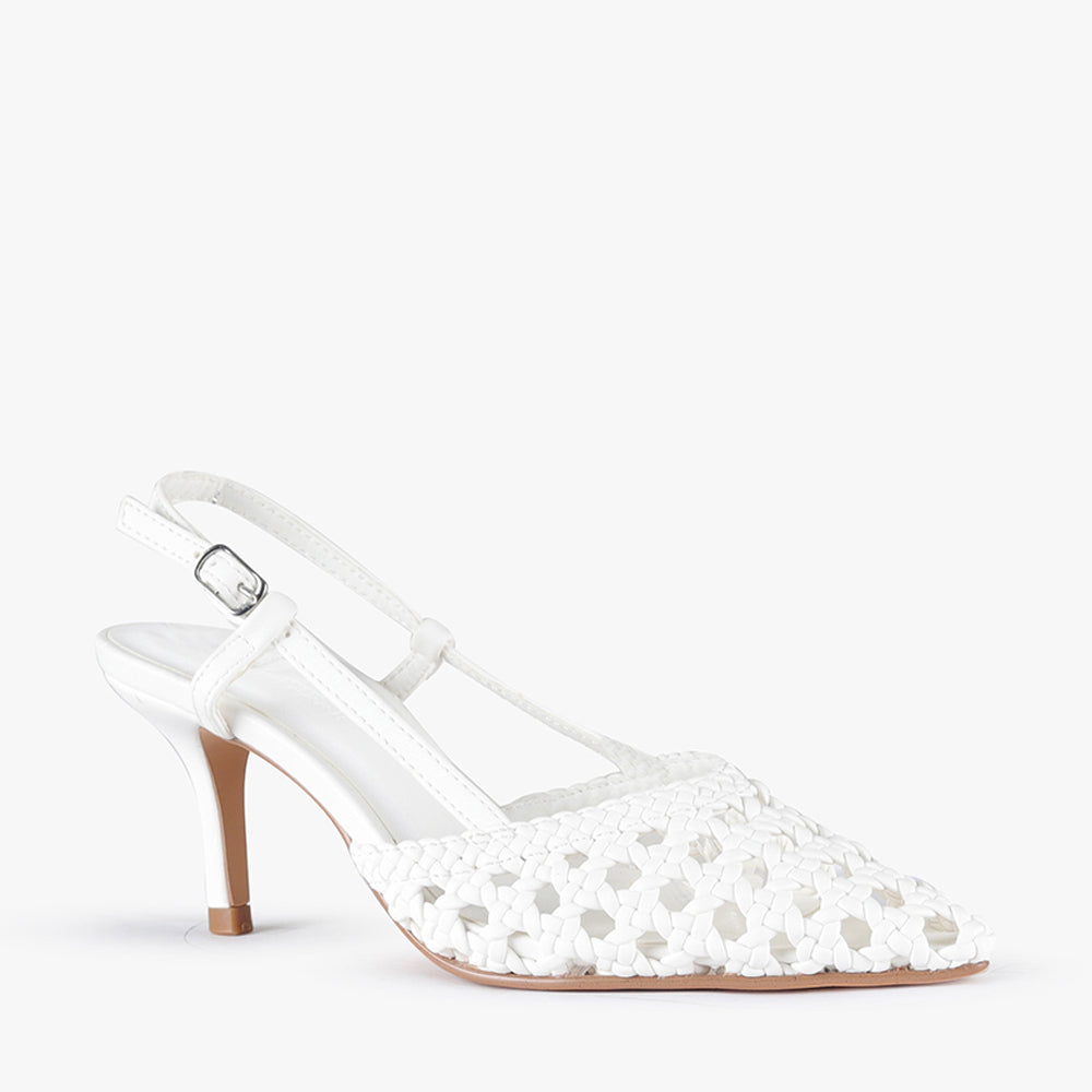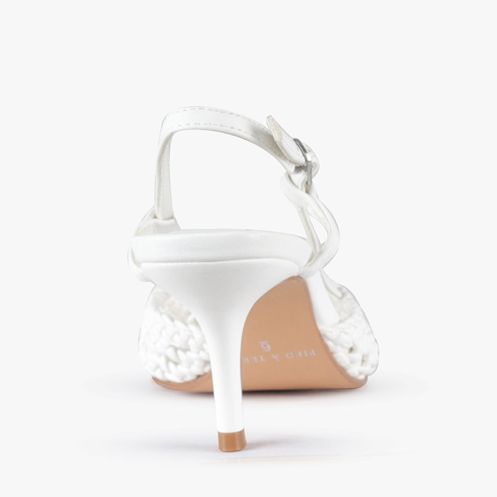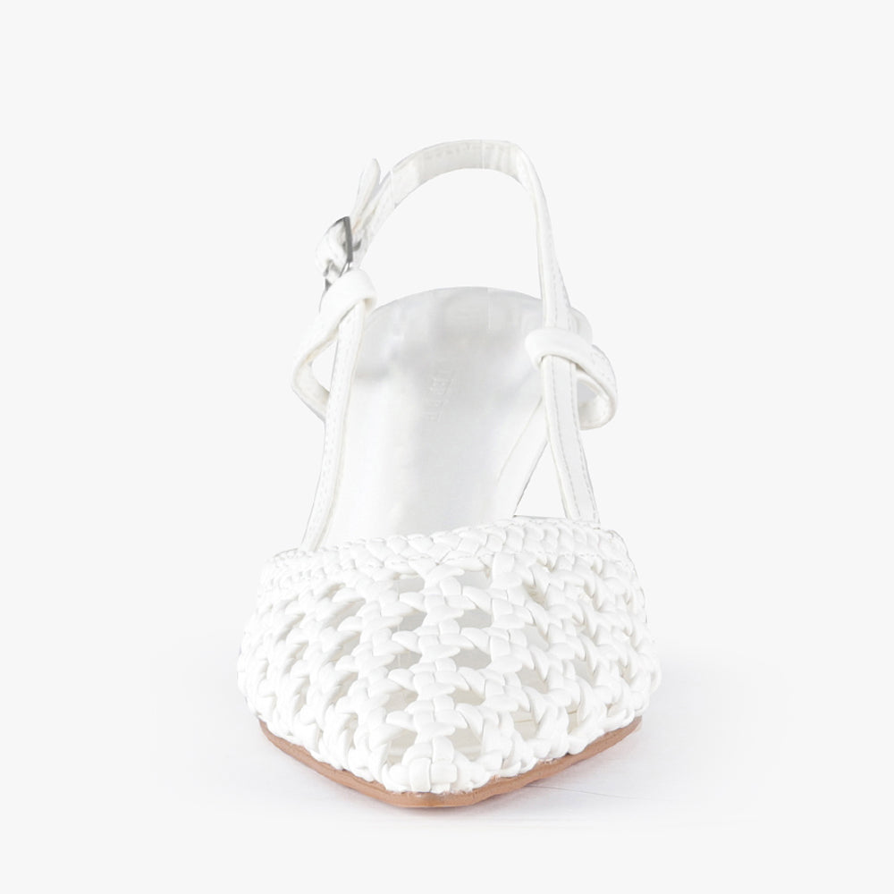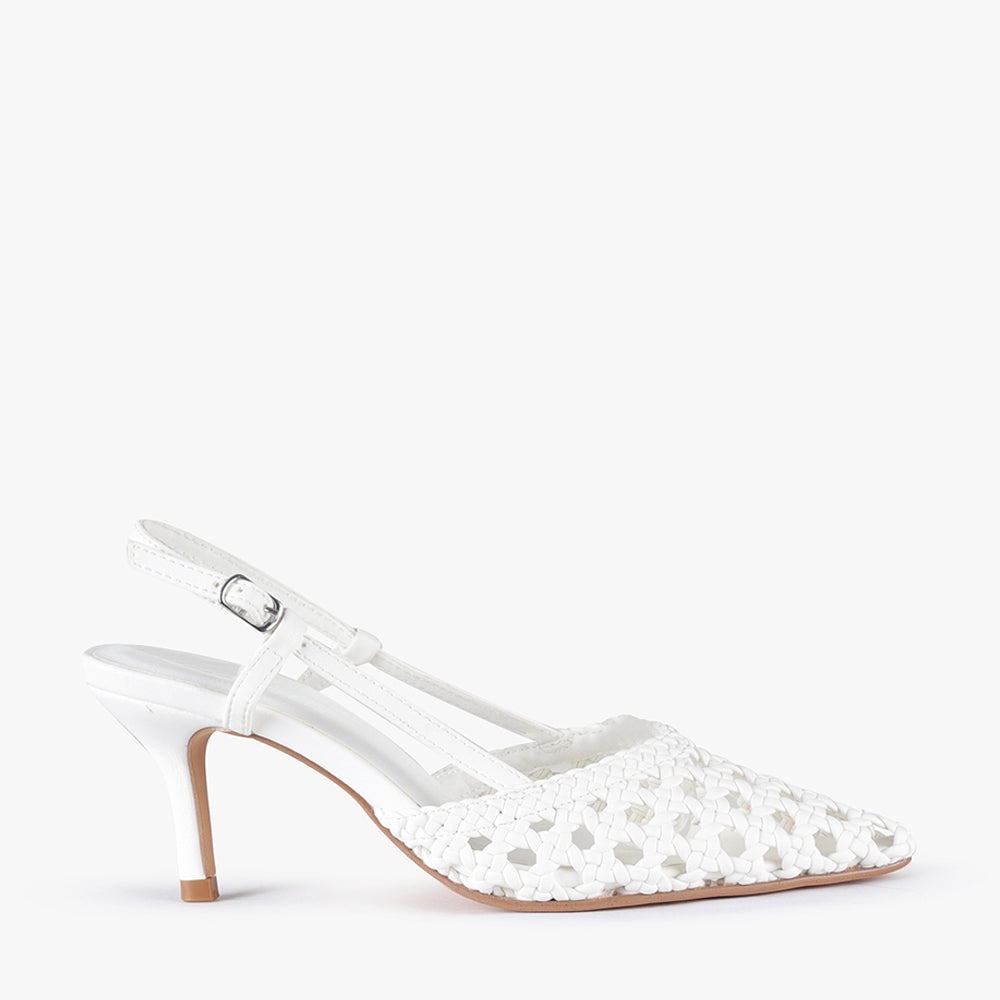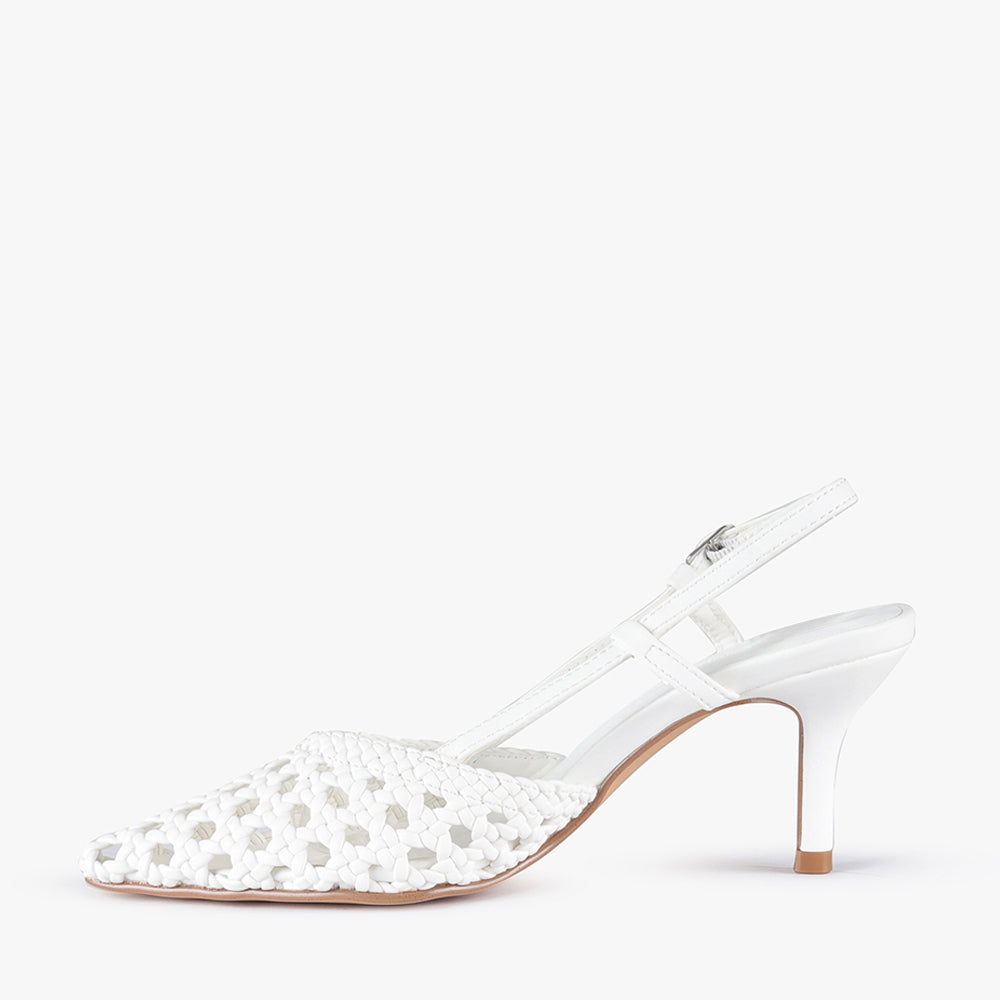 Elevate your style with this luxurious woven sling-back pump. Featuring a sleek and unique design, this shoe exudes sophistication and comfort. Featuring a mid stiletto heel and a perfectly pointed toe, these heels are fit for every occasion.