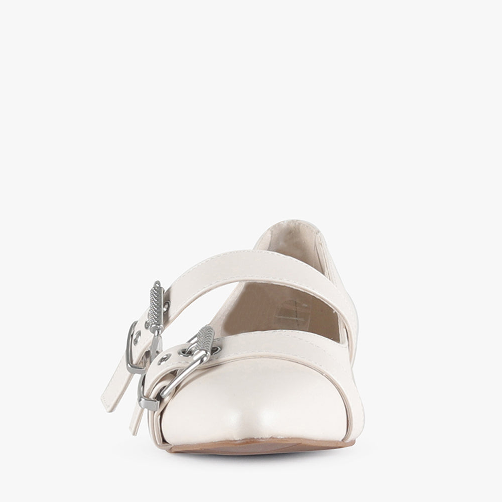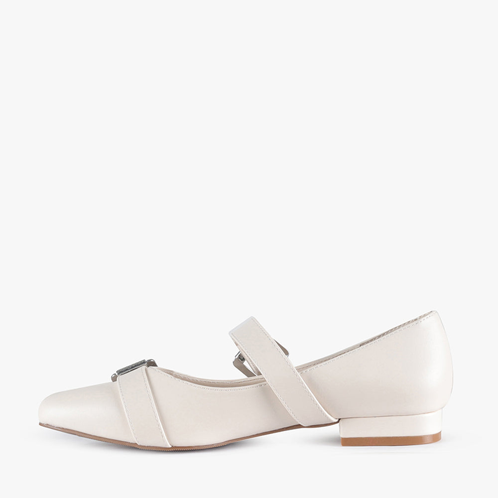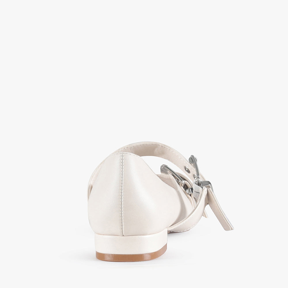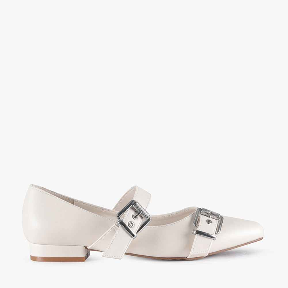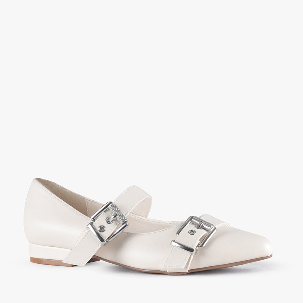 A sophisticated pointed toe flat featuring an elevated buckle detailing. These versatile shoes blend comfort with chic design, making them perfect for both office wear and evening outings. The pointed toe silhouette elongates your legs while the decorative buckles add a touch of refined personality to any outfit.