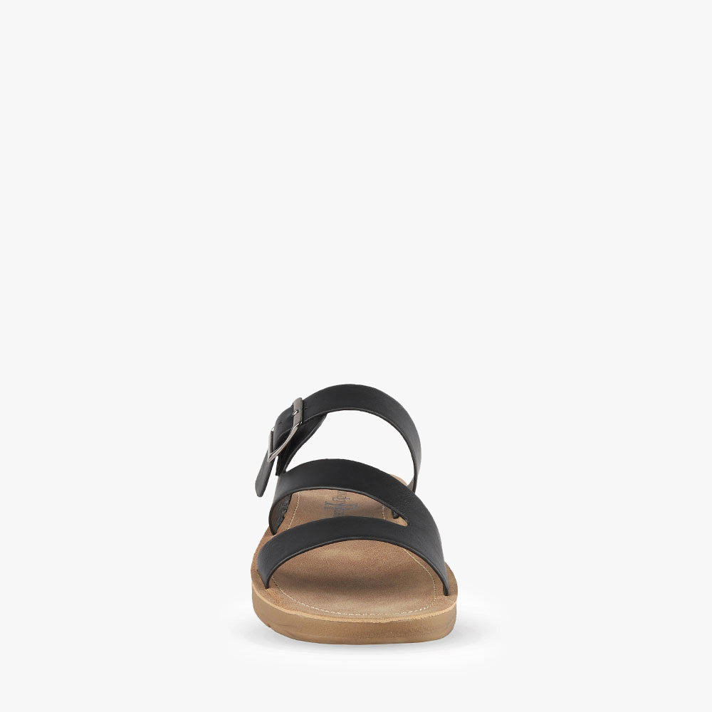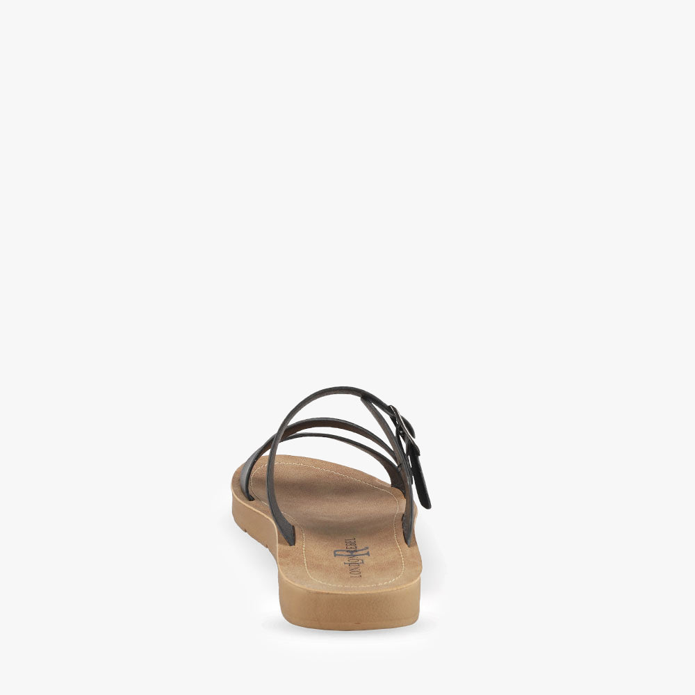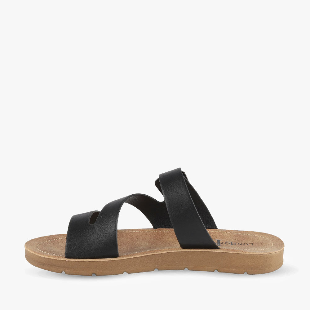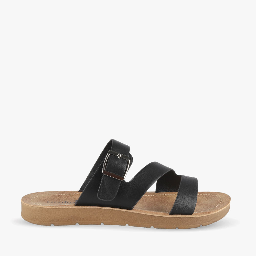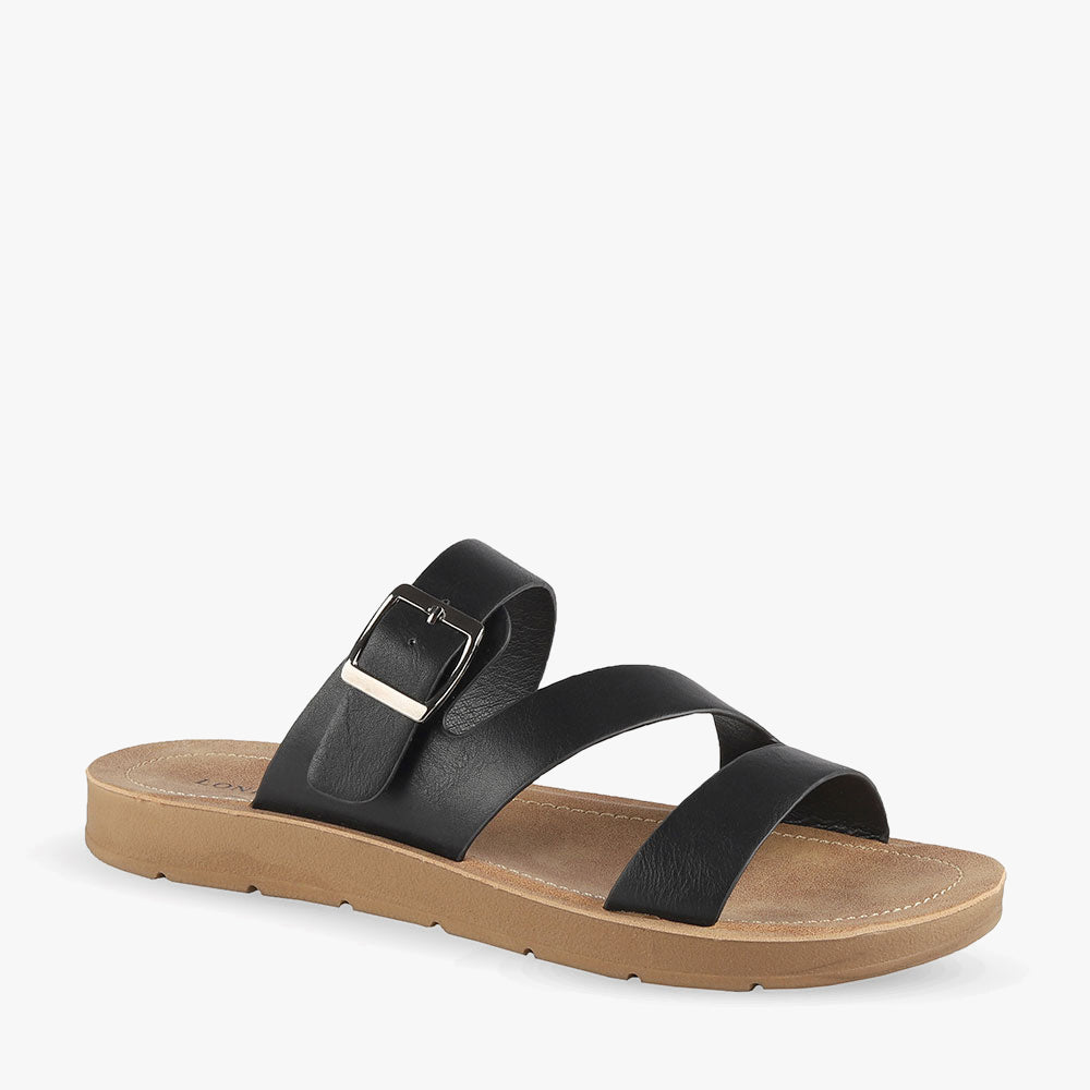 Dayoff is a flat sandal featuring asymmetrical straps and an adjustable buckle. Team these sandals with denim shorts and a basic tee for a relaxed effortless look. Cruise around in Dayoff by London Rebel.