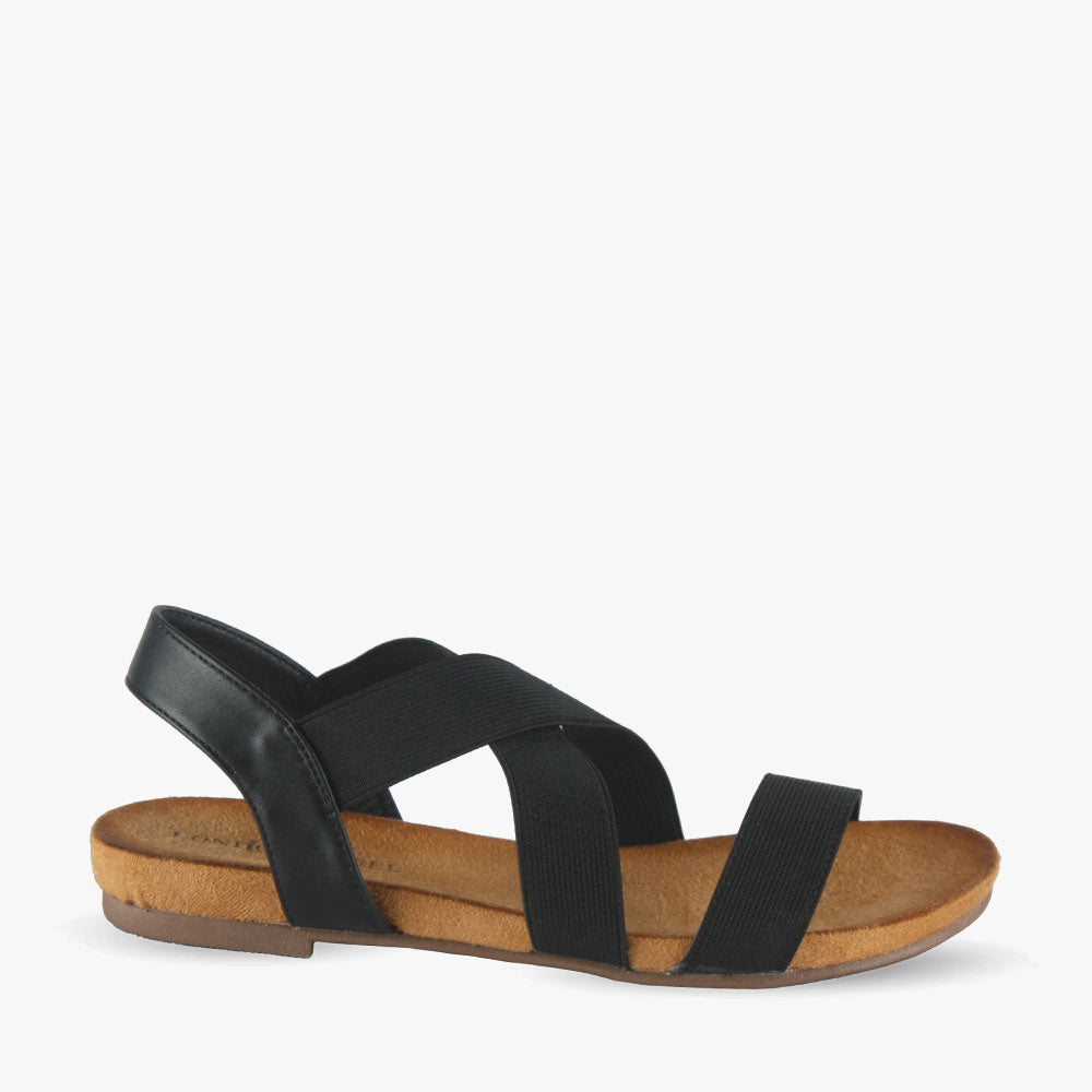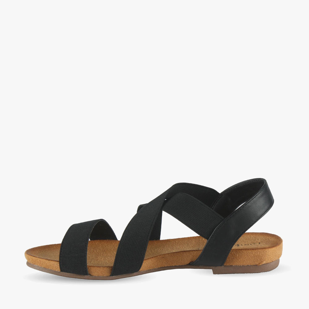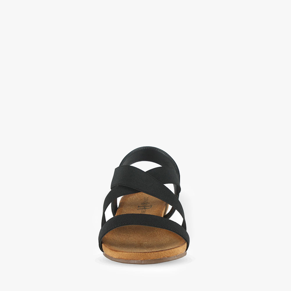 Everyday is a strappy sandal. Featuring a single strap across the toes and two similar elastic straps crisscrossing the vamp and adjoining a leather like ankle strap. The versatility and comfort of these sandals make it your ideal everyday sandal. Pair with jeans and your fave graphic tee for errand runs or throw on a playful dress for sunny adventures. Slip on Everyday by London Rebel.