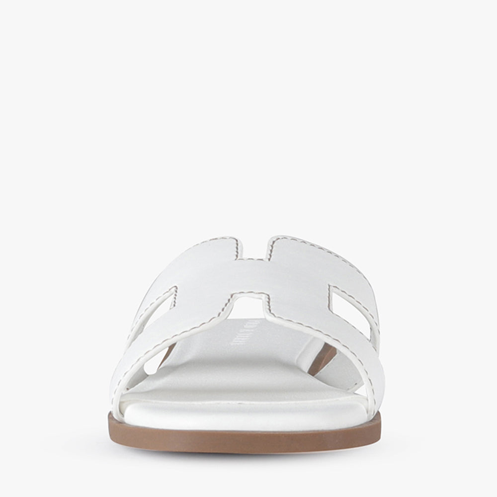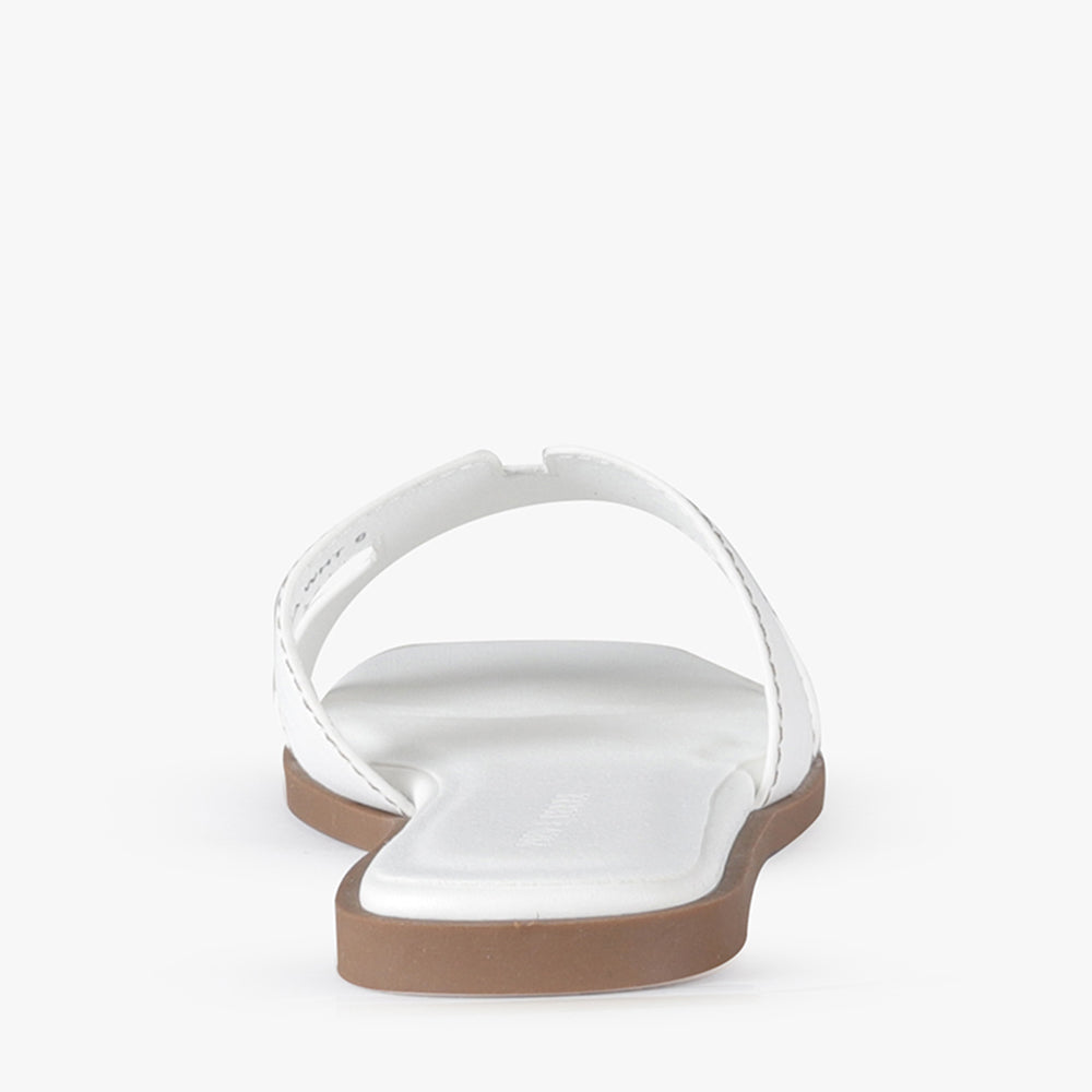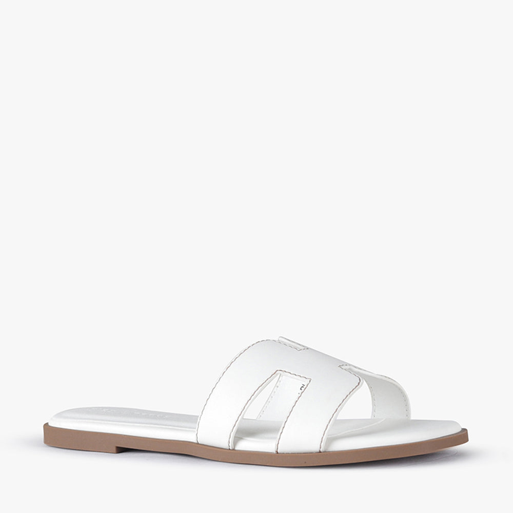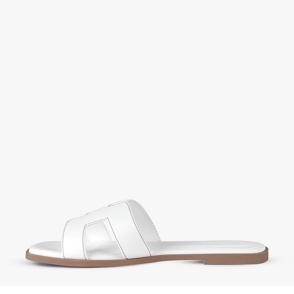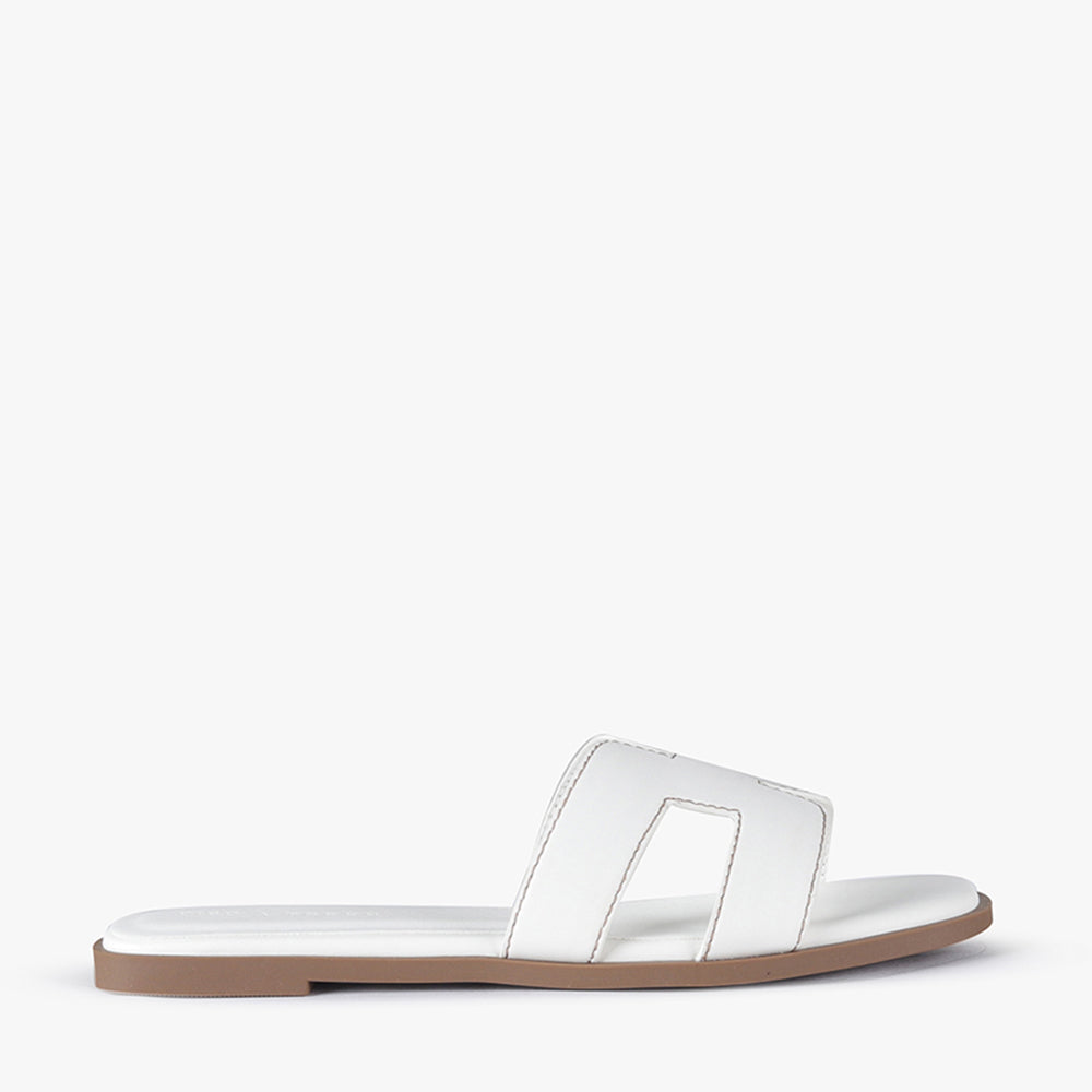 Leia is a slide-on flat sandal.