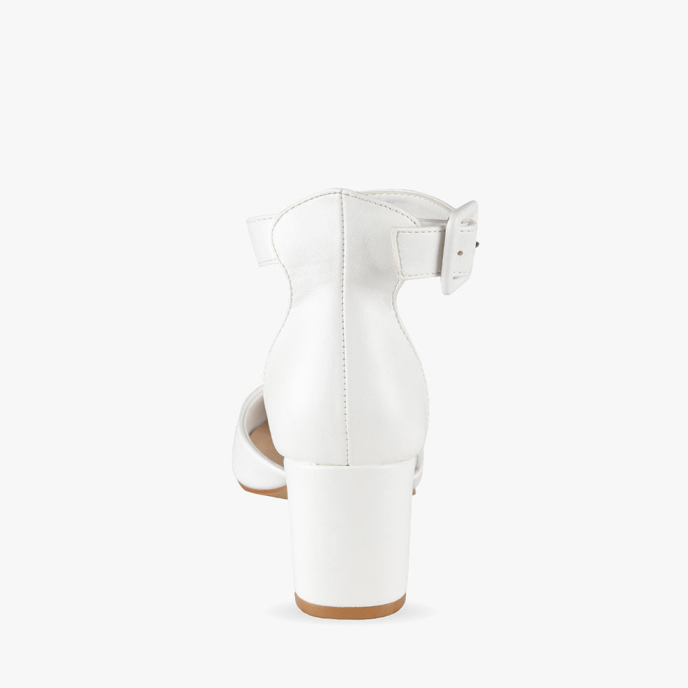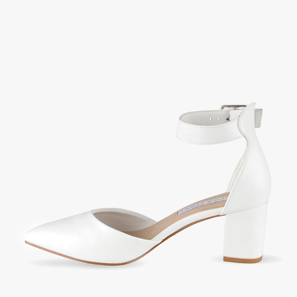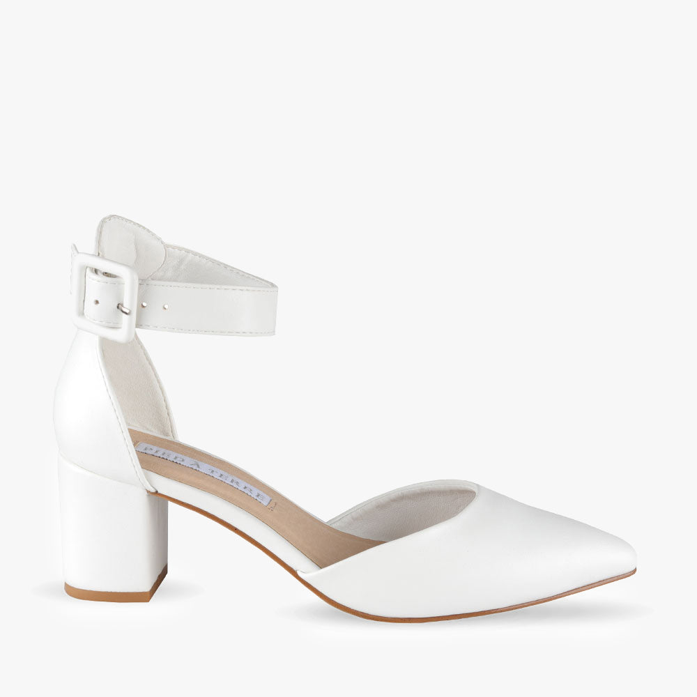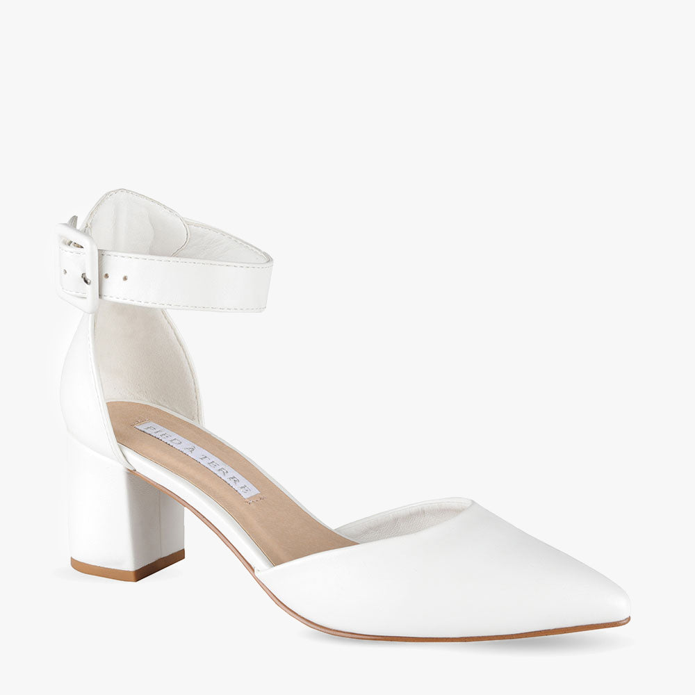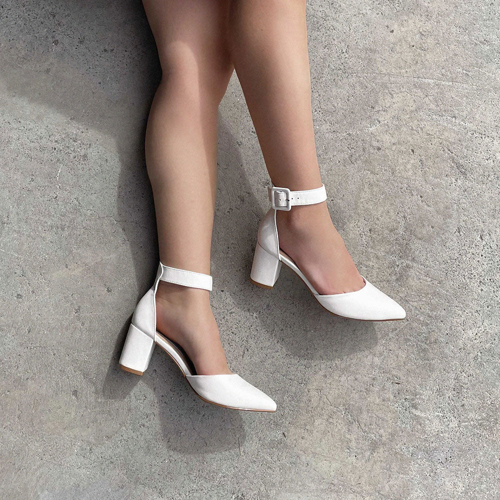 Lunchtime is a pointed toe heel. Featuring a strap around the ankle with a square buckle and a mid block heel. Lunchtime is trendy, classic and will fit into your wardrobe seamlessly. A great choice for the office or dressed up with a fun, flowy party dress. Put a pep in your step with Lunchtime heels by Pied A Terre.