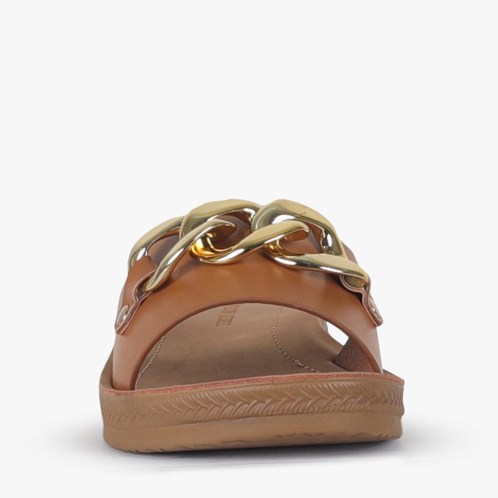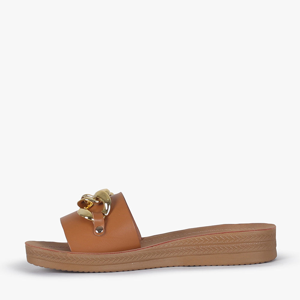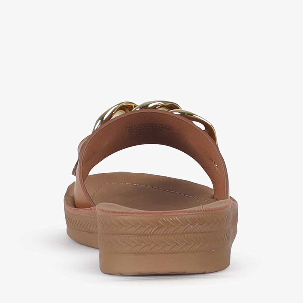 Elevate your style game with Maise - the perfect side-on sandal! Featuring a chic chain detail, it adds a touch of sophistication to any outfit. Effortlessly slide them on and experience the ultimate comfort from the padded sole.