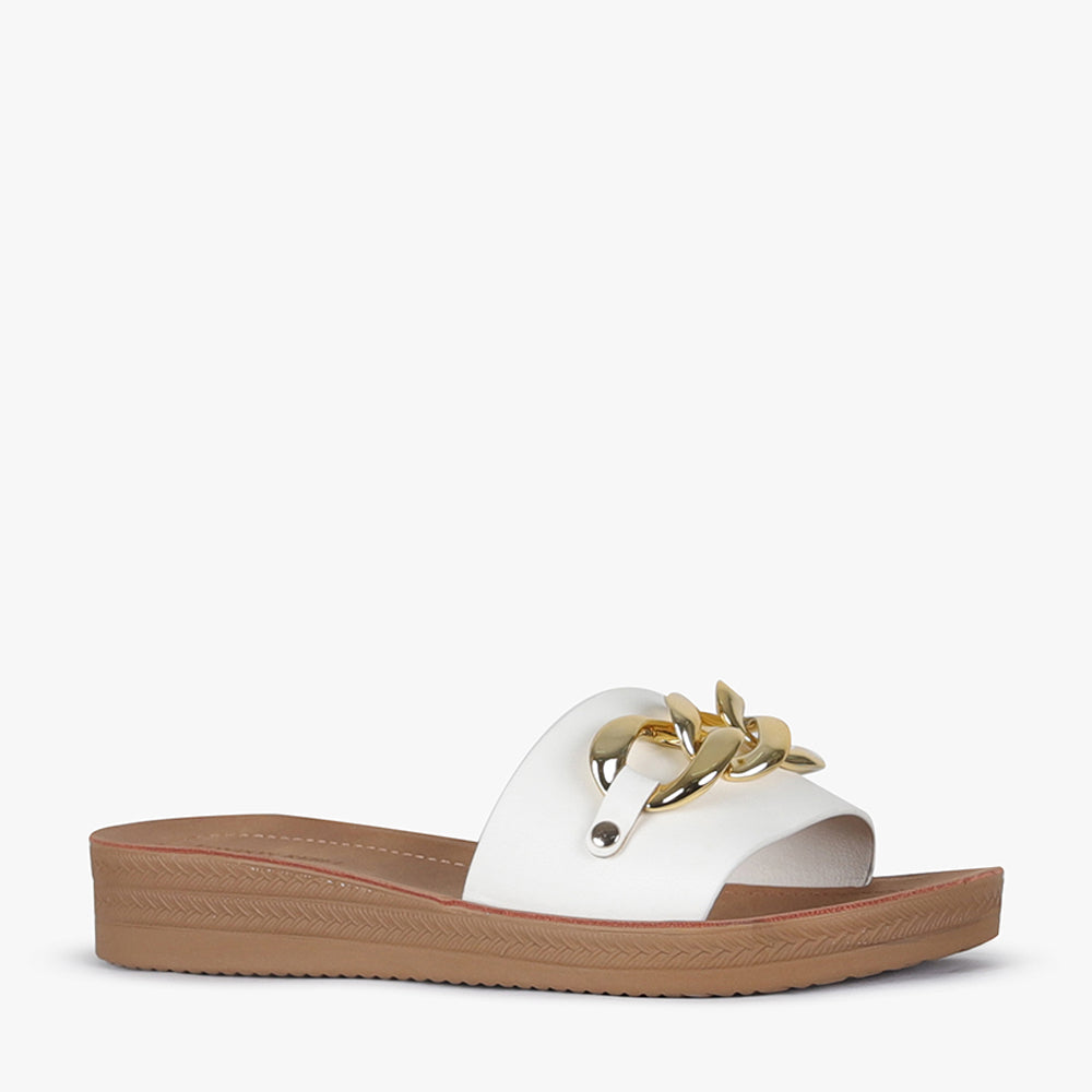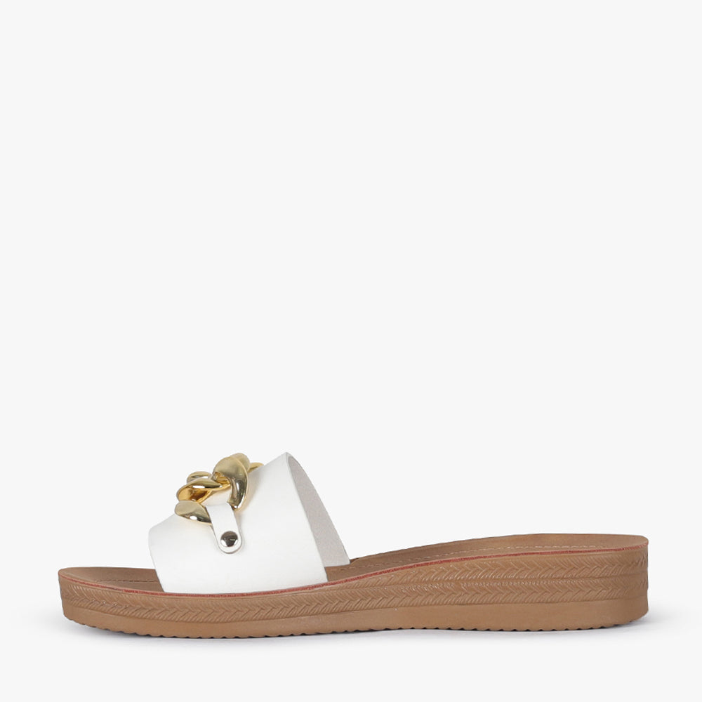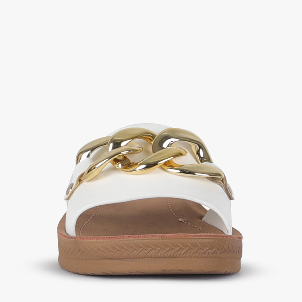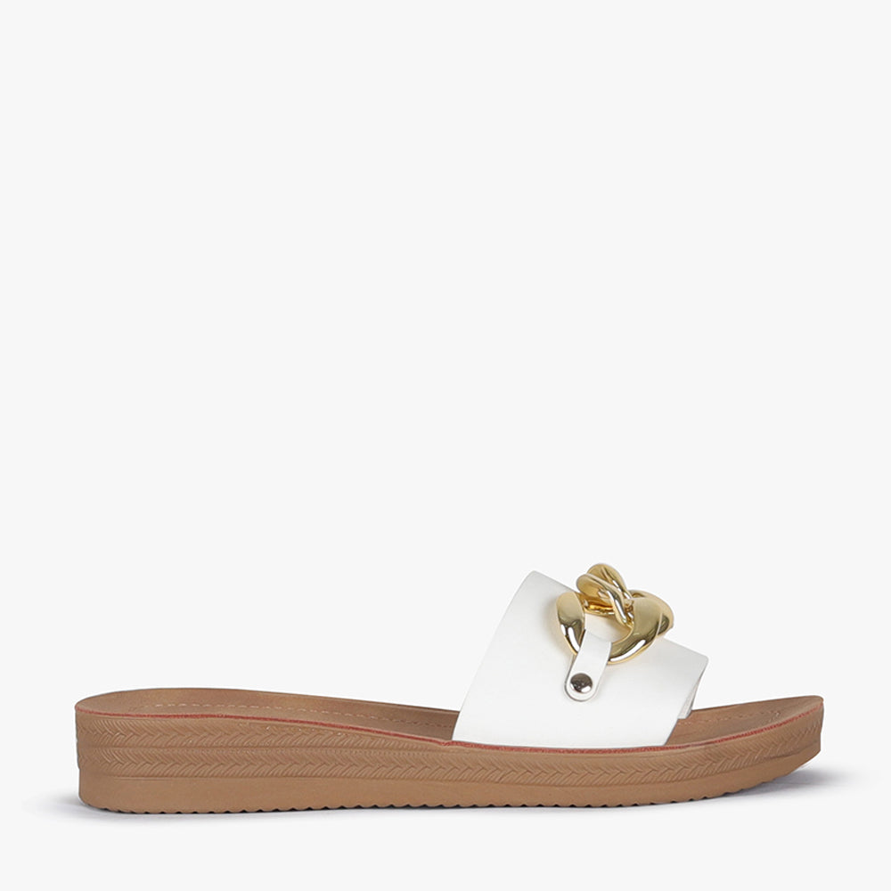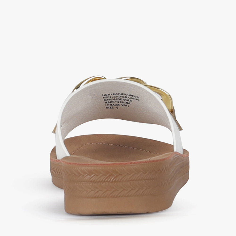Elevate your style game with Maise - the perfect side-on sandal! Featuring a chic chain detail, it adds a touch of sophistication to any outfit. Effortlessly slide them on and experience the ultimate comfort from the padded sole.
