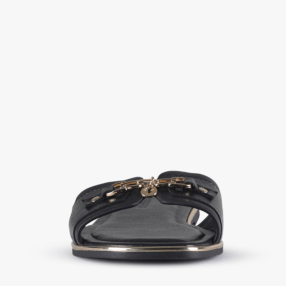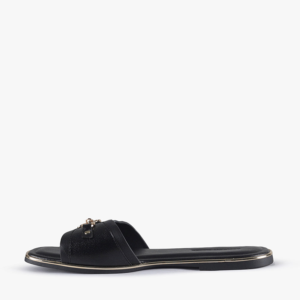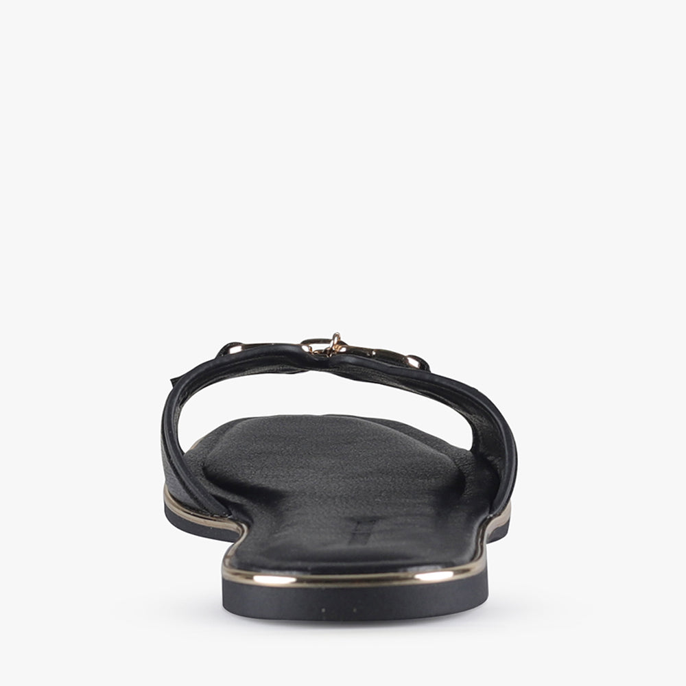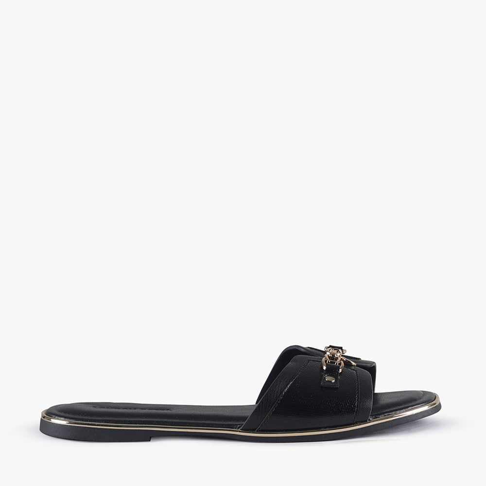 A stunning flat slide sandal with luxurious gold trim. Slip into style and comfort with this must-have accessory. Perfect for any occasion, Micky will elevate your look while keeping you comfortable all day long. Make a statement with every step in these trendsetting sandals.