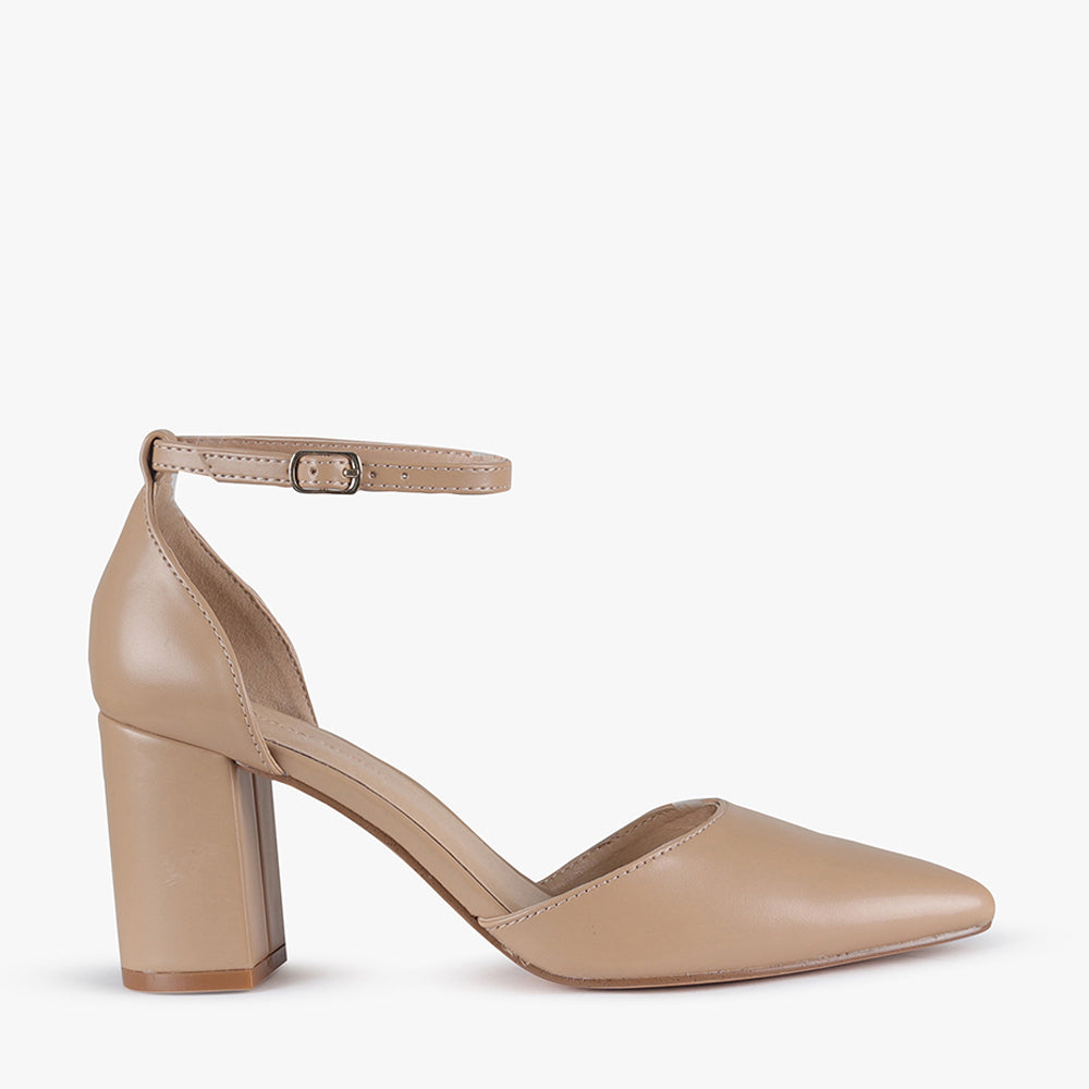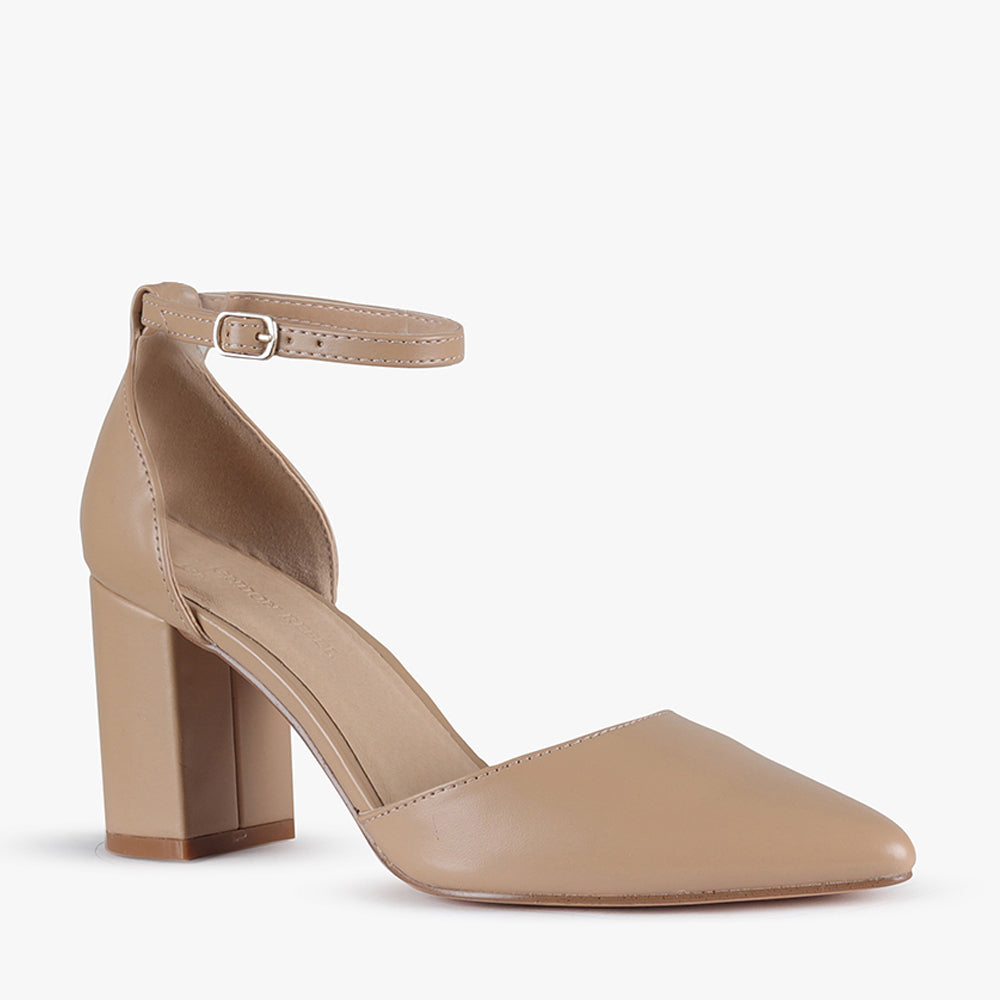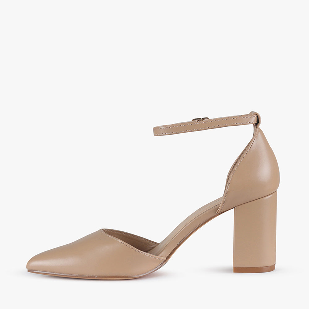 Designed for both elegance and comfort, these heels feature a sleek pointed toe and a secure ankle strap that adds a chic touch. The pocket back provides extra support, making them perfect for all-day wear. These versatile heels will complement any outfit and keep you looking fabulous.