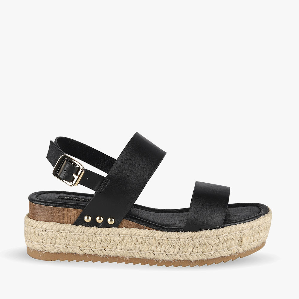 Featuring wooden-look accents, espadrille sole, over the vamp strap secured with gold studs and boasting a buckled slingback heel strap. Step out in style in Milko by Pied A Terre.