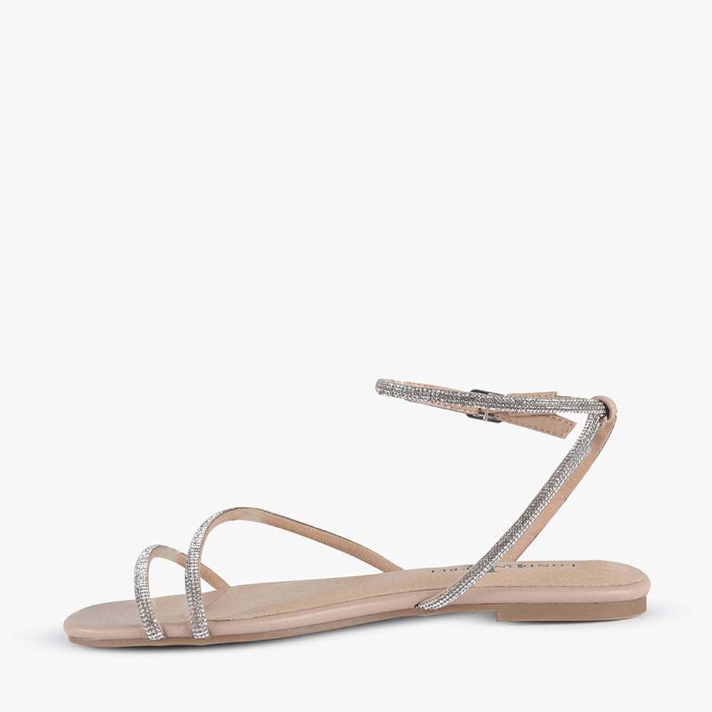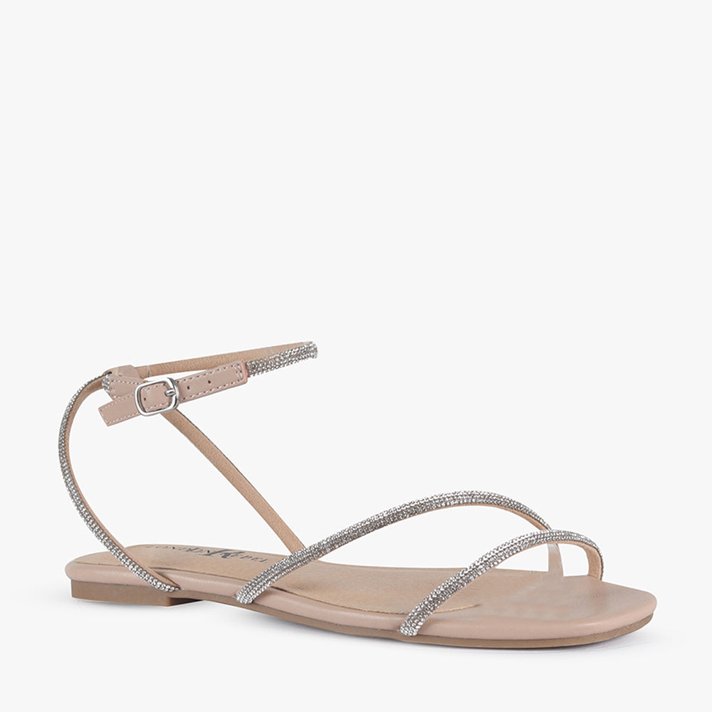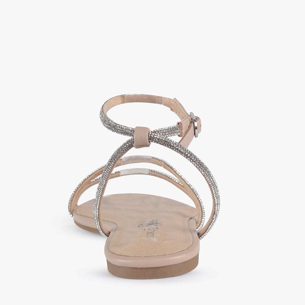It’s time to rock every casual look with this pair of blingy strappy sandals. These open-toe flats feature dainty embellishments on two front straps and a back strap. They will make every outfit look elegant and trendy.
