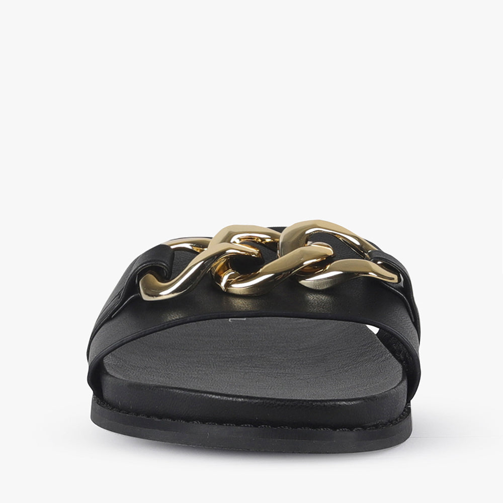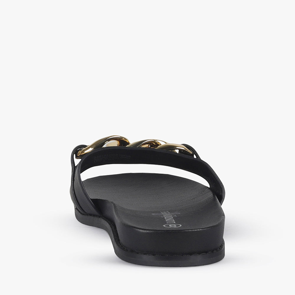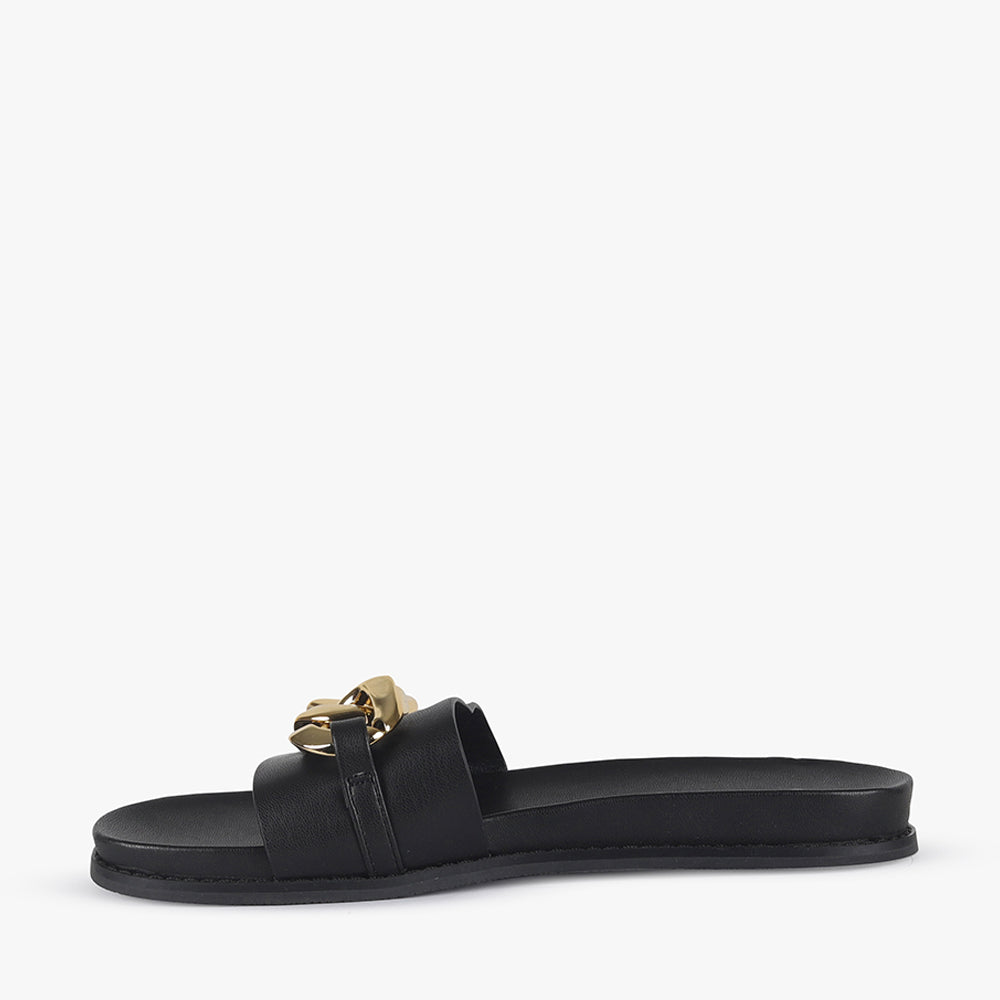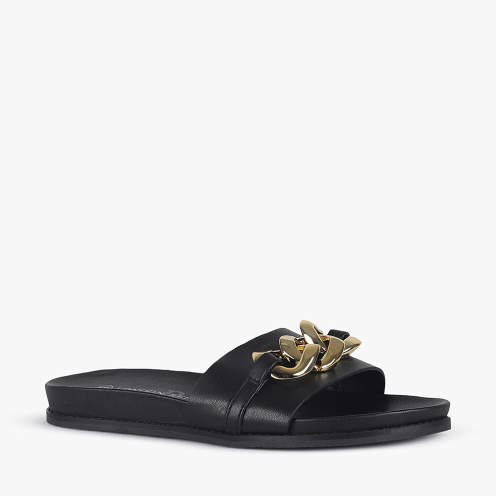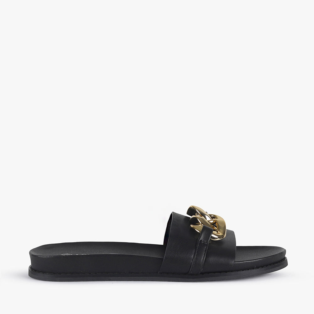 Featuring a moulded base and single band upper it is the perfect slide on and go sandal! With a gold chain embellishment this sandal is easily dressed up or down.