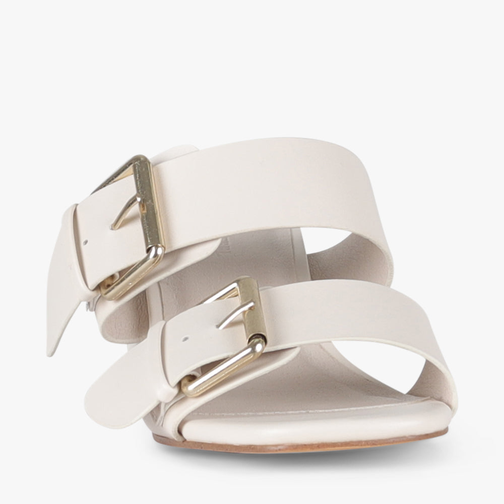 Featuring a sleek buckle detail, this sandal offers adjustable comfort and a secure fit. The mid-height block heel provides both stability and a subtle lift, making it perfect for all-day wear. Elevate your look with a versatile design that seamlessly blends sophistication and ease.