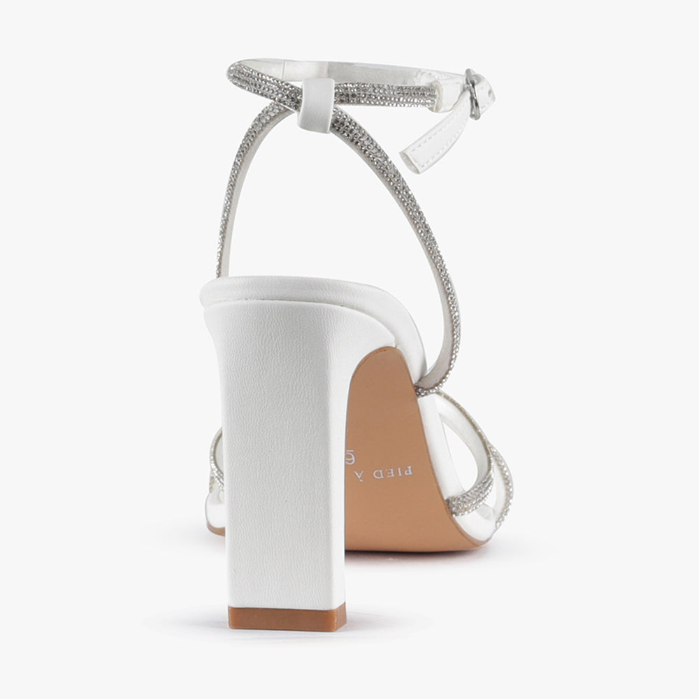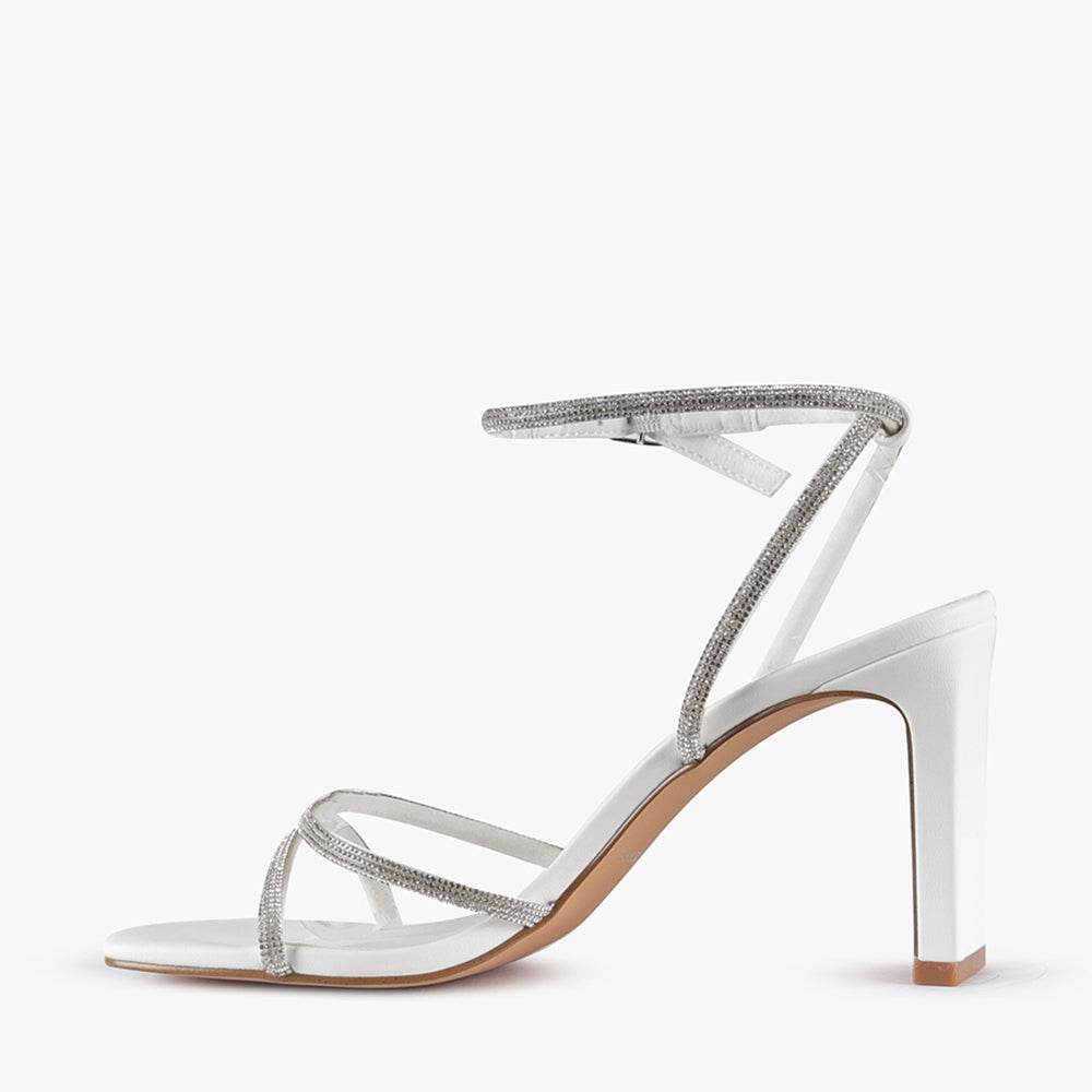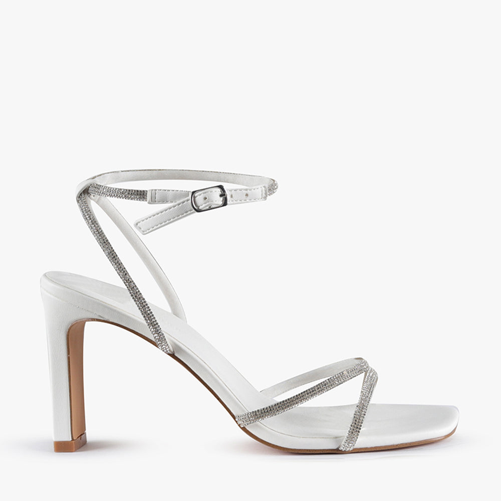 Take your outfit to new heights with Skyler, the ultimate high-heel sandal adorned with diamontes. Featuring a comfortable slim block heel, and an adjustable ankle strap this heel will be your go-to for your next event. Get ready to turn heads and make a statement with Skyler.