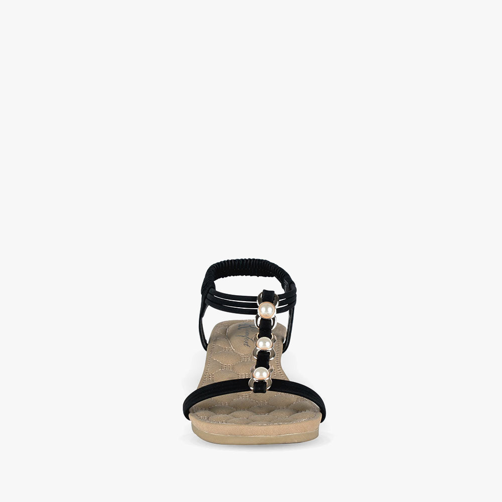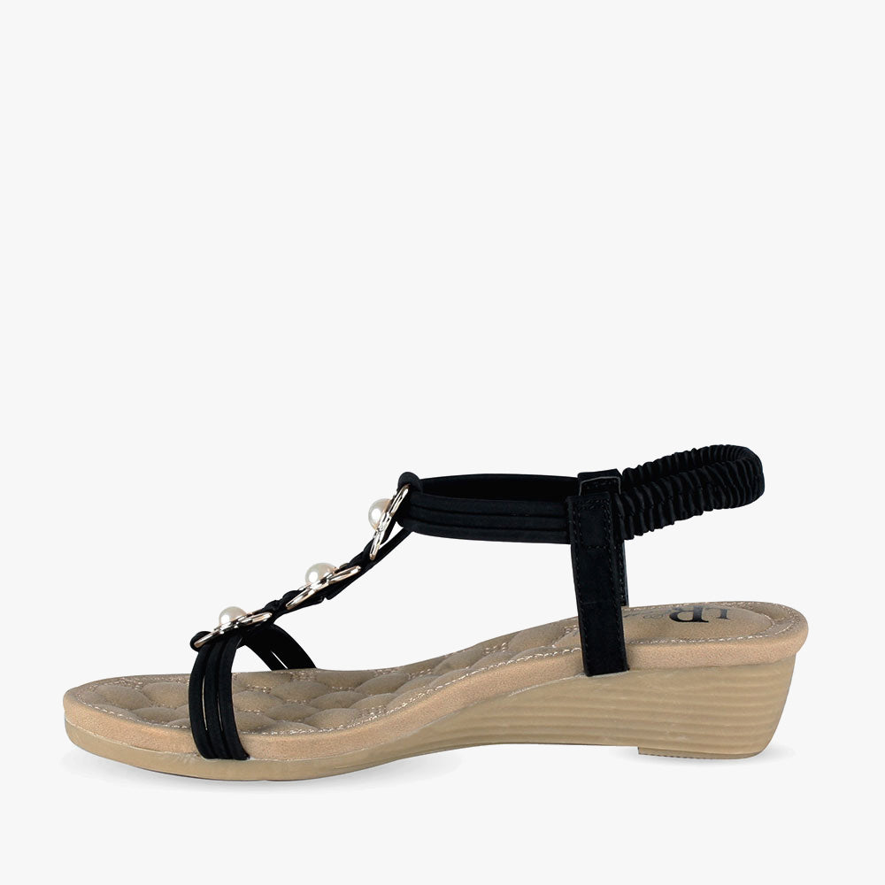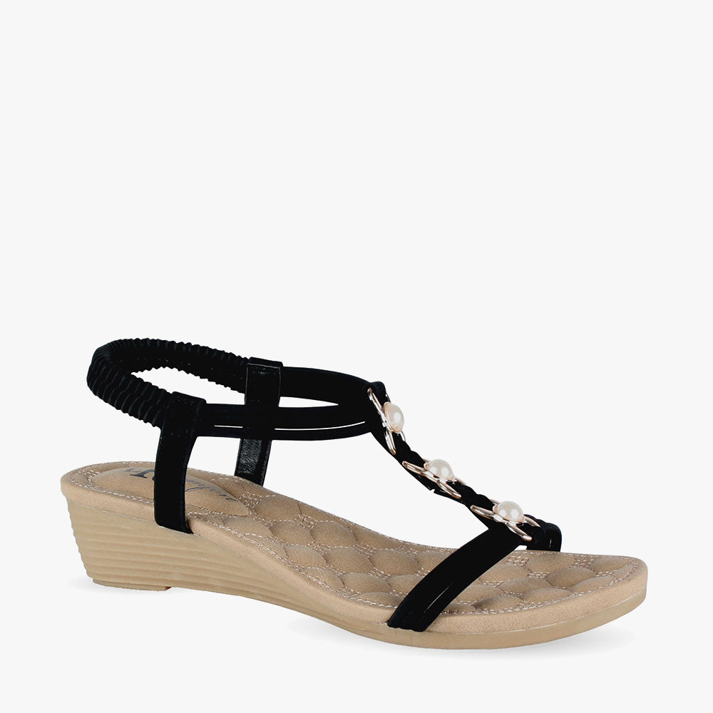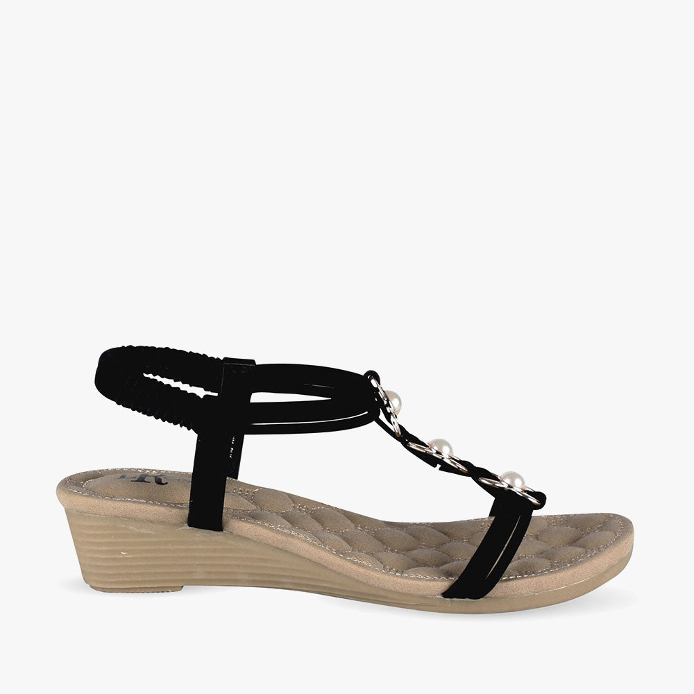 Tulum is a low wedge comfort sandal. Featuring an embellished T-bar strap adorned with beads, an elasticized back and padded insole, wear Tulum wedges with a floaty dress and floppy hat for ultimate vacation vibes. Wander along in Tulum sandals by London Rebel Comfort.