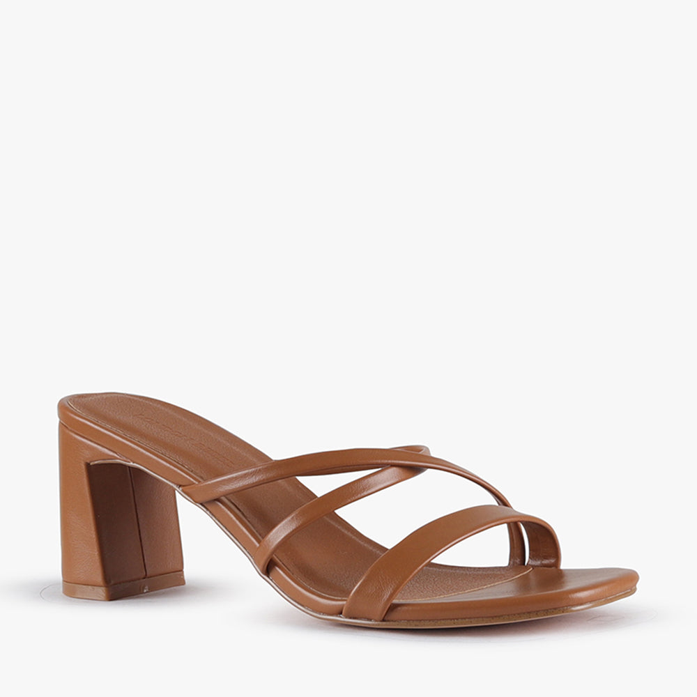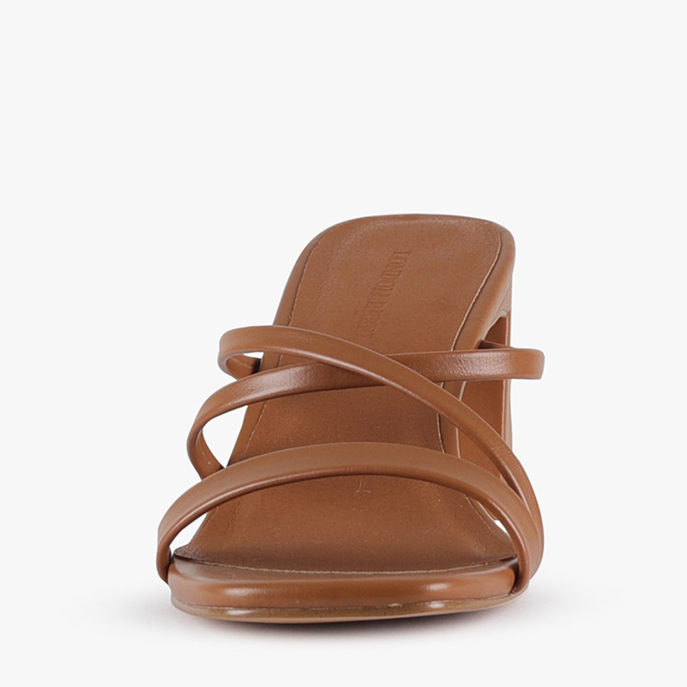This lower block mule is a versatile and minimal heel. With its thin cross over straps, squared off open toe and comfortable heel height it is sure to be on heavy rotation.